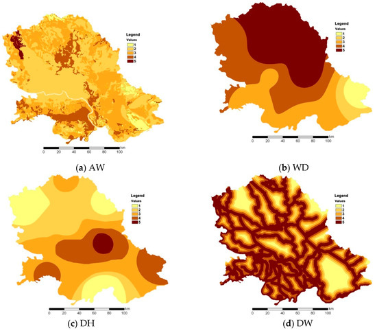 The spatial distributions of suitability ratings (regarding all the analyzed criteria) are presented in the suitability maps (criteria layers) for irrigation (Figure 5a–d). All the layers are identically georeferenced and have the same pixel resolution, which enables the GIS overlay analysis.