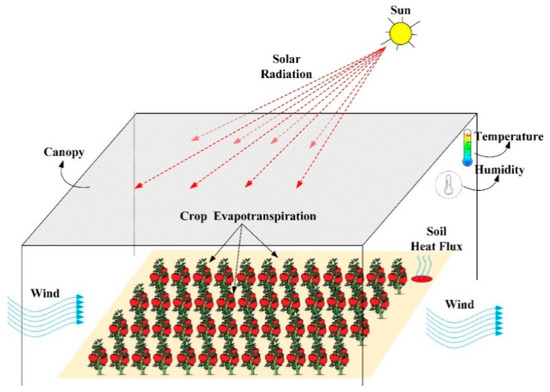 Crop water requirement depends on the growth conditions as well as internal and external factors [4,5]. Biological characteristics, crop species, and growth stage are some of the internal factors influencing the water requirement of a crop. On the other hand, external factors can be classified as climatic and soil conditions. Climatic conditions include solar radiation, temperature, relative humidity, water surface evaporation, wind speed, etc. Soil texture and soil moisture content are some of the key factors related to soil conditions. In case of sufficient soil moisture, climatic conditions can become the limiting external factors affecting crop water demand (as shown in Figure 1). Typically, the amount of water used for the irrigation exceeds the crop water requirement and one of the mechanisms responsible for the loss of water is the ET process.