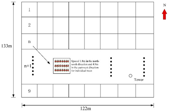 Schematic of peach field layout is shown in Figure 2. The dimensions of the orchard are 122 m in the east–west direction and 133 m in the north–south direction. The trees are spaced 1.8 m apart between the rows and 4.9 m within a row. The whole orchard is equally divided into 72 irrigation plots with each plot consisting of 24 trees in three rows with eight trees per row [2].