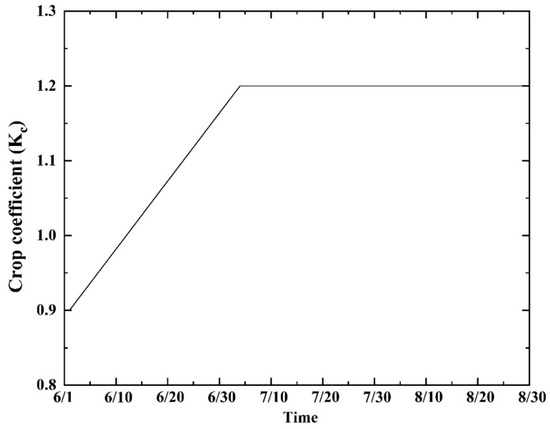 is mostly calculated by the indirect method combining crop reference with corresponding . In the study, is obtained from the same peach variety from an adjacent orchard using a large underground weighing lysimeter [41], and the seasonal curve is shown in Figure 3 [40]. It is noted that the coefficient increases almost linearly starting from June till the early July and remains constant in the later part of July and August.
