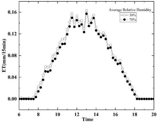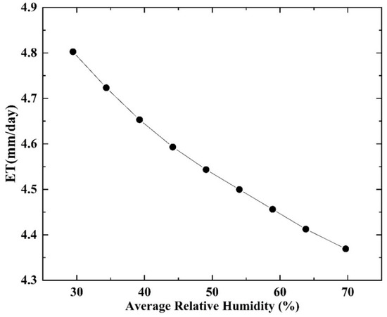 In Figure 7, ET rate is plotted over a day for relative humidity of 30% and 70%. As seen from the figure, the profile of the ET rate obtained for both humidity conditions is very similar. This clearly shows that ET rate may not change significantly over a wide range of relative humidity. To further illustrate the nature of this relationship, in Figure 8, total ET in a day is plotted for different values of relative humidity considered. As the relative humidity is varied from 30% to 70%, total ET decreases only by 9%.