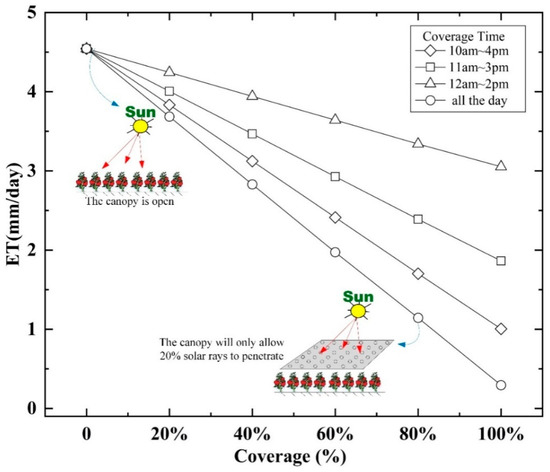 In the past different methods to calculate and measure ET have been used to study effect of shading screen on the ET and water use efficiency [35,36,37]. Reduction in ET and increase in water use efficiency due to the use of shading of screen have been reported [35,36,37]. Using a black shading screen, a reduction of 38% in crop water requirement has been reported [36]. Similarly, an increase of 25% in water use efficiency has also been reported [37].