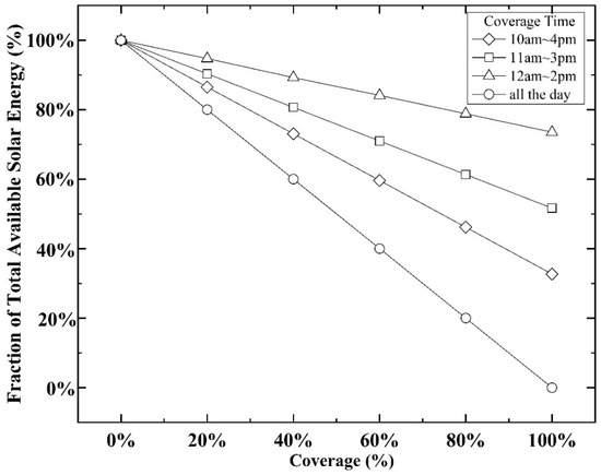 Relationship curves between Fraction of Total Available Solar Energy (%) and different coverage percentage on a typical day.