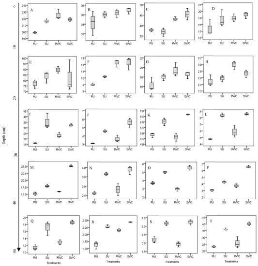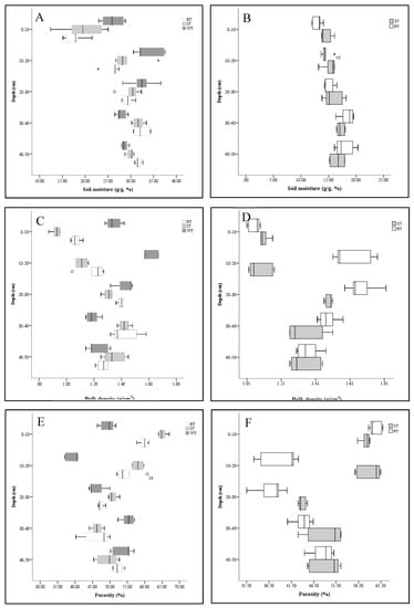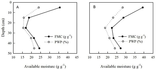 It is known that tillage could significant enhance the soil structure. Therefore, relative to rotary tillage, the subsoil tillage treatments yielded significant decreases in soil BD and compaction in the 0–35 cm soil profile layer (Figure 1 and Figure 2A). Furthermore, porosity, field moisture capacity (FMC), and permanent wilting percentage (PWP) in each layer were significantly higher under the subsoil tillage treatments than that under the rotary treatments (Figure 1 and Figure 3, whereas there were no significant differences in moisture between the two tillage treatments (Figure 1). However, the range of available moisture in the 0–35 cm soil profile layer was significantly higher, by 3 to 5%, in the tillage treatments than in the rotary treatments (Figure 3).