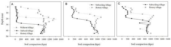Soil compaction (kPa) at 0–50 cm depth in the experimental field in 2013. A, after tillage before sowing; B, the silking stage; C, the mature stage.