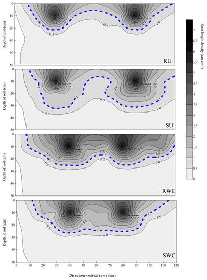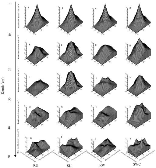 Due to the narrow plant spacing in the treatments with wide–narrow planting (RWC and SWC; 40–70 cm in the horizontal direction; Figure 5), the root classes overlapped, and the root length densities were significantly higher in these treatments than those in the uniform spacing treatments (RU and SU; 30–80 cm in the horizontal direction; Figure 5) in the 0–30 cm soil layer. In addition, because of the tendency of roots to avoid each other, the root length densities in the treatments with wide spacing (RWC and SWC; 10–30 cm and 80–120 cm in the horizontal direction; Figure 5) were slightly higher than those in the treatments with uniform spacing (RU and SU; 10–20 cm and 90−120 cm in the horizontal direction; Figure 5), but the differences were not significant (p < 0.05).