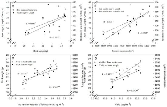 Analyses of the correlations among the root distributions at different depths, WUE, and yield showed that the length and surface area of roots in the 20–30 cm soil layer were significantly and positively correlated with total root weight (Rlength = 0.597 *, Rarea = 0.656 *; Figure 7A) and total root surface area (Rlength = 0.670 *, Rarea = 0.852 **; Figure 7B). These increases in root weight and surface area were the main contributors to the increases in the shoot to root ratios of weight and area, respectively. A similar relationship was observed between each of the weight and surface area of roots and WUE (Rweight = 0.764 **; Rarea = 0.853 **; Figure 7C). In particular, maize yield was significantly and positively correlated with both root weight and root surface area (Rweight = 0.742 **, Rarea = 0.895 *; Figure 7D).