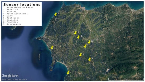 Accompanying the aformentioned measurements is the next part of the dataset that consists of weekly trap counts of the years 2015–2018 between the months of July and September, that is, the time period in which olive fruit flies are most active and are able to reach peak population []. All in all, a total of 92 locations were used to deploy traps, using a mixture of TinyTag and SmartCitizen sensors. The locations were situated in North-West Kerkyra, Greece and their selection was based on maximisation of the diversity of environmental characteristics of olive groves, in terms of elevation, mean relative humidity, orientation to solar radiation based on near-by hills and proximity to the sea. These locations can be intuitively separated into three types: on or near to the coast of the island (designated henceforth as “Beach” types), on or very near to the top of hills (designated henceforth as “Hill” types) and valley-type locations that are surrounded by hills and have a north-eastern orientation (designated henceforth as “Valley” types). Indicative/selected locations from the 92 aforementioned are detailed in Table 1 and shown on the map in Figure 1.