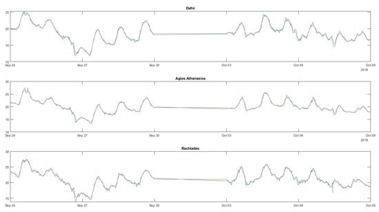 Figure 2 and Figure 3 show the recorded temperature and humidity for selected sensors in the aforementioned common time period. The blue line indicates the actual data, while the red line shows the data after smoothing by use of overlapping rolling window mean.
