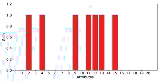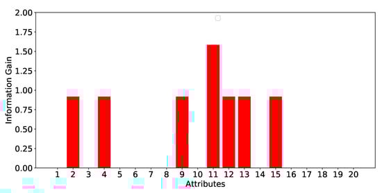 Finally, the diagram in Figure 6 shows the information gain of the candidate features for the feature vector. As shown in the diagram, the same seven characteristics as the diagram of Figure 4 show the greatest gain of information. Specifically, characteristic 11 provides the highest information gain (1.585), while the remaining six characteristics (2, 4, 9, 12, 13, 15) offer the same gain of information, 0.918. The remaining features do not provide any gain of information.