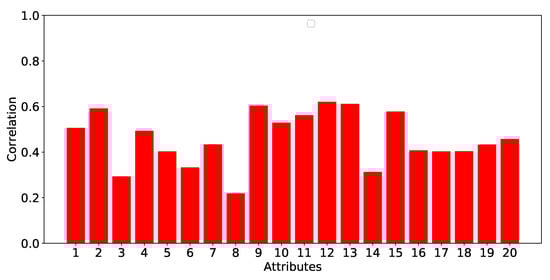 Figure 5 shows the value of each attribute by their correlation coefficient in regard to the “Microclimate” cluster class. As can be seen from the diagram, the seven attributes that showed the highest information gain ratio (see Figure 4) plus attribute 10 (“Average absolute difference between maximum and minimum daily temperatures”) have the highest correlation (greater than 0.5).