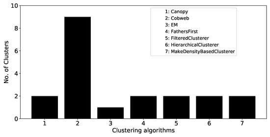 Figure 7 shows the number of clusters the data were split into after applying the clustering algorithms (Canopy, Cobweb, EM, FarthersFirst, FilteredClusterer, HierarchicalClusterer, MakeDensityBasedClusterer). The majority of these algorithms split the examined locations into two clusters, while the EM algorithm grouped all nine locations into one cluster. Finally, the Cobweb algorithm assigned each location to its own cluster, namely nine.