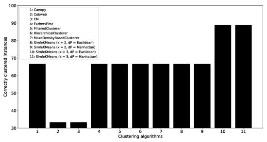 Figure 8 shows the accuracy of correct clustering of the samples from the clustering algorithms used in our experiments. The lowest performance was attained by EM and Cobweb algorithms with 33% accuracy. The K-means algorithm had the best performance (89%), with k = 3 for both of the distance functions considered. The remaining algorithms had a similar performance, which was approx. 66%.