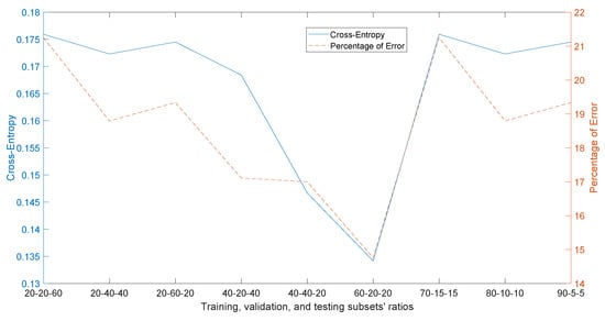 In order to test the NN-based classification, we initially tested the effect of the division of the dataset into training, validation and testing subsets. Figure 9 shows that the best results for both Cross-entropy and Percentage of error were achieved, with significant differentiation to other alternatives for the division with 60% training, 20% validation and 20% testing. Accordingly, the rest of the experimentation on the NN-based classification was done with this division ratio.