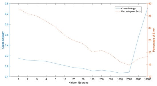 The next experiment focuses on the on the effect of the hidden neurons on Cross-entropy and Percentage of error. Figure 10 shows the results obtained for a variety of different hidden neurons’ values ranging from 1 to 10,000. The results indicate that the best result as far as cross-entropy is concerned is achieved for 1000 hidden neurons while the lowest percentage of error is achieved for 2500 hidden neurons, though cross-entropy’s difference between 1000 and 2500 hidden neurons is almost negligible.