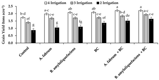 Effect of Agrobacterium fabrum, Bacillus amyloliquefaciens with/without biochar (30 Mg ha−1) on grains yield (tons acre−1) in wheat cultivated in drought-stressed field conditions.