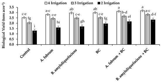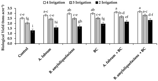 Effect of Agrobacterium fabrum, Bacillus amyloliquefaciens with/without biochar (30 Mg ha−1) on biological yield (tons acre−1) in wheat cultivated in drought-stressed field conditions.
