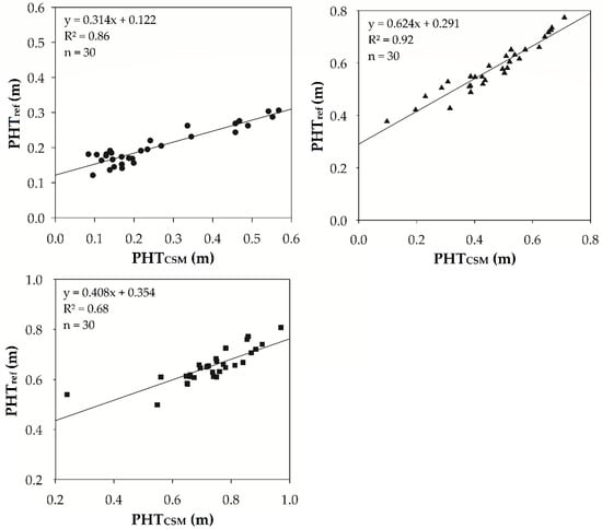Linear regression between plant height deviated from CSM (PHTCSM) and manual height measurements (PHTref) for each mission. p < 0.001 for all R2. Symbols indicate datasets from Mission 1 (●), Mission 2 (▲), and Mission 3 (∎).