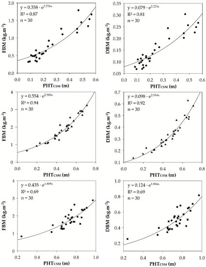 Additionally, a cross-validation analysis was performed combining datasets of all missions. The multi-temporal dataset (n = 90) was split randomly, using a proportional number of samples of each mission. 70% of the data (n = 63) was used for calibration, combining PHTCSM versus FBM and DBM, and 30% of the dataset (n = 27) was used for validation, using a linear regression between estimated and observed biomass.