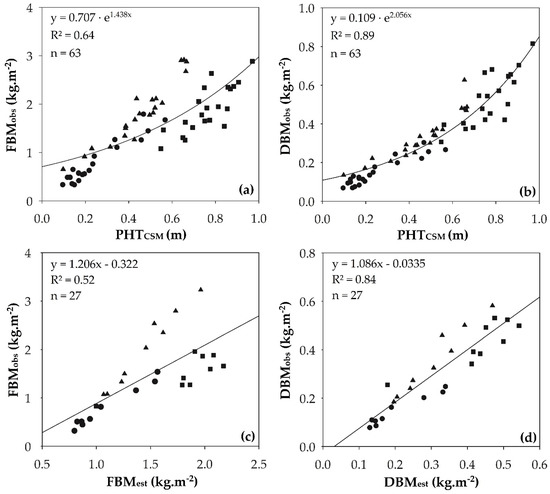 Cross-validation relationship between biomass and PHTCSM for FBM (a) and DBM (b) from calibration datasets and between observed versus predicted FBM (c) and DBM (d) derived from validation dataset. Symbols indicate datasets from Mission 1 (●), Mission 2 (▲), and Mission 3 (∎).