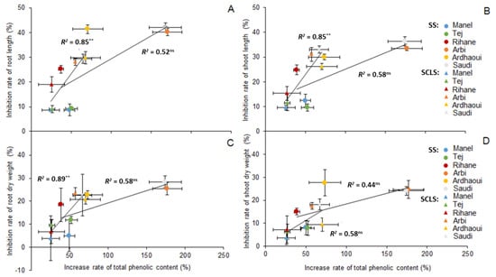Relationship between the increase rate of total phenolic content (mean ± horizontal SE of five replicates) and the inhibition rate of (A) root and (B) shoot length and (C) root and (D) shoot dry weight of great brome (B. diandrus) plants (mean ± vertical SE of five replicates, each with 10 plants). Different symbols indicate the barley genotypes cultivated in sandy substrate (SS; circle symbols) or in sandy-clay-loam substrate (SCLS; triangle symbols). The coefficients of regression (R2) are given and followed by the level of significance: ns p > 0.05, * p ≤ 0.05, ** p < 0.01, *** p < 0.001.