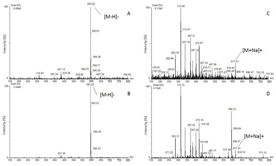 ESI-mass spectrometry (MS) full scan spectra of saponarin obtained in negative [M − H]− and positive [M + Na]+ ion modes from sandy extracts pre-cultivated by (A,C) ‘Saudi’ genotype and (B,D) standard, respectively.