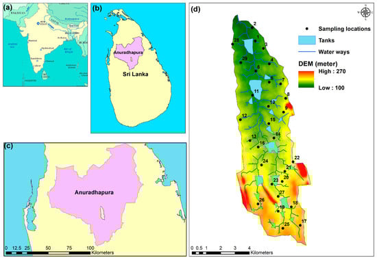 The tank cascade system (TCS), used mainly in the dry and intermediate zones of Sri Lanka since the third century BCE, is considered as one of the most efficient traditional water management systems in the world, and is still an essential element of water management for agriculture in Sri Lanka [22,23]. The key concept of the TCS is recycling and reuse of water through a network of tanks organized within micro-catchments to store and convey water (by gravitational flow) originating from ephemeral rivulets [24]. TCSs collect rainwater, maintain water content of the soil and groundwater, control soil erosion, and maintain the ecological balance [9]. During the last few decades, the usage of groundwater in the dry zone of Sri Lanka has rapidly increased owing to the inability of surface water resources to cater to growing demand, hastening the deterioration of water quality in the tank cascade landscape [23].