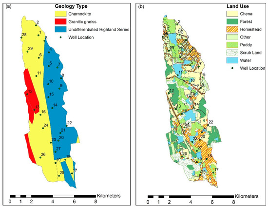 The study area is underlain by charnockite, granitic gneiss, and undifferentiated Highland Series rocks (Figure 2a). The major aquifer type in the tank cascade landscape is a shallow regolith aquifer of 2–10 m in thickness. The groundwater potential is limited owing to a low groundwater storage capacity and the transmissivity of the underlying crystalline basement [28]. Groundwater has been extracted for irrigation and domestic purposes for more than 2000 years from dug wells [29]. The farmers in the dry zone draw irrigation water from large-diameter “agro-wells”, as agricultural activities are prominent in this area. Commonly grown upland crops (e.g., chilli, eggplant, okra, banana, etc.) are grown under rainfed “chena” cultivation. Other main land uses are paddy, forest, and homestead (Figure 2b). Two major growing seasons are recognized in Sri Lanka: the Maha (wet) season and the Yala (dry) season. The Maha season, from October to February, receives rainfall from the second inter-monsoon (depression and cyclonic storms in the Bay of Bengal) and north-east monsoon. The Yala season, from April to August, receives rainfall from first inter-monsoon (Convective type) and the south-west monsoon [30,31]. We assessed groundwater quality parameters over 12 months to investigate seasonal variations in irrigation water quality.