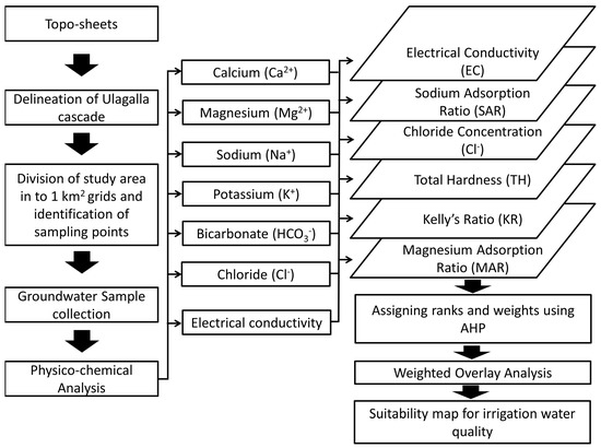 Although mapping is used worldwide to demarcate areas with suitable groundwater for irrigation in regions with a continuous water table [26,27], regions without a continuous water table have been neglected. Further, no attempt has been made to map irrigation water suitability zones in tank cascade landscapes or similar environments. Hence, we used GIS and AHP to model spatial and temporal variations in irrigation water quality in a tank cascade landscape, and established a protocol to classify the groundwater suitability for irrigation.