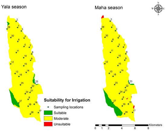 Although there was no major difference in irrigation water quality between seasons, the monthly zoning maps showed greater variation in several months of the Maha season than in the Yala season (Figure 6).