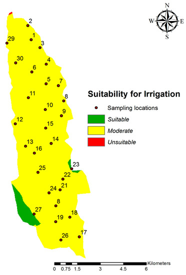 Understanding the seasonal variation of groundwater quality is important in management decisions. However, for planning or policy decisions, we need an overall idea about the groundwater quality of the area. Hence, we developed the overall irrigation water suitability map of the cascade by overlaying the 12 months irrigation suitability maps (Figure 5) to demarcate suitable, moderately suitable and unsuitable areas for irrigation. In the overall irrigation water suitability map, 4% of the cascade is suitable, and 96% is moderately suitable for irrigation (Figure 5).