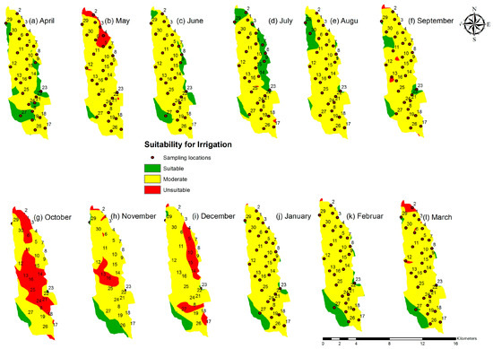 A similar pattern was observed during the Yala season. In general, the Yala season receives less rainfall than the Maha season [31]. However, during the study period, it received more rainfall than the Maha season. From April to August (except in May), most of the groundwater in the Ulagalla cascade was moderately suitable for irrigation (Figure 6a–e). In May, high intensity heavy rainfall caused substantial runoff with a high concentration of contaminants (Figure 6b), reducing irrigation water quality at the bottom (northern end) of the cascade. These results confirm that irrigation water quality in this area is influenced by heavy rainfall rather than by total rainfall, not only at the beginning but also in the middle of the rainy season.