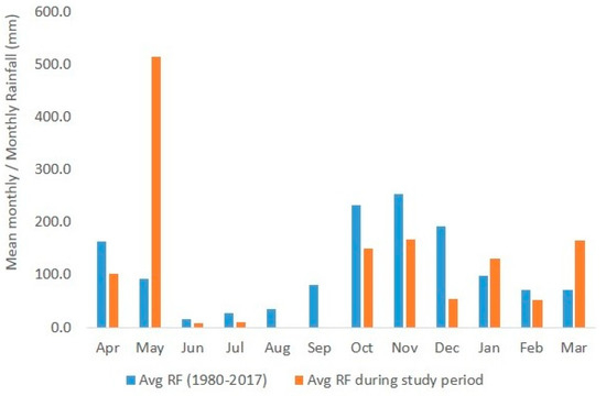 Monthly average rainfall (RF) during the period 1980–2017 and monthly rainfall during the study period.