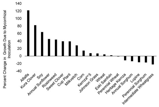 These studies demonstrate that manipulations with AM fungi can successfully increase the productivity and survival of several perennial crop candidate species, while having little effect on non-mycorrhizal species, such as the cluster-rooted Lupine plants []. In the greenhouse study, we generally found that legumes and composite plant types benefit more strongly from AM fungal inoculation than grass and cereal crop species. Our results are consistent with these previous findings that C3 grasses tend to be less mycorrhizal than other plant functional groups [], as we found that some C4 grass species and most C3 grasses exhibited slightly negative responses to mycorrhizal inoculation. We also found that plant response to inoculation in the greenhouse was strongly correlated with that plant’s response to our increasing mycorrhizal gradient in the field, where non-mycorrhizal species in the greenhouse also did not benefit from mycorrhiza in the field and strongly mycorrhizal plants in the greenhouse were more and more productive with increasing amounts of mycorrhizal inocula in the field polyculture planting. Correlations between plant response to inoculation in the field and greenhouse measures of responsiveness have been observed in previous work in annual and native plant systems [,,].