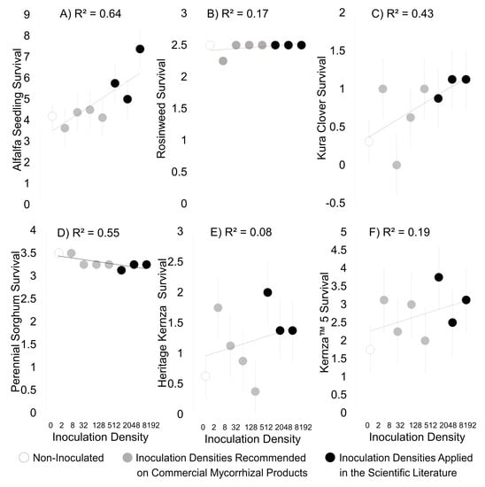 For the field experiment, we analyzed the growth and total number of surviving plants of each species during the establishment year. Growth data were transformed as log (1+ plant size). Plant size metric collected varied by species due to their different growth strategies and uses (i.e., fodder vs. seed value). We used total aboveground biomass (g) for alfalfa, total seed weight for perennial Sorghum, total tiller or leaf number for Heritage Kernza, Kernza™ 5, and Kura clover, and total leaf number * rosette size for Rosinweed. We analyzed these data using Proc GLM in SAS [] using block and inoculation density as predictors. To test how plants responded to the different a priori categories of inoculation density (none, those reflecting commercial application suggestions, and those used in scientific literature), we broke plant response into 7 contrasts comparing the difference between and among these three categories. We also designed a linear contrast to test if plant response increased with rank of inoculation density. After determining the slope of the response line to rank of inoculation density for both plant growth and plant survival, we tested that slope with that plant’s mycorrhizal responsiveness as determined in the greenhouse study as predictor in a linear regression in R [].