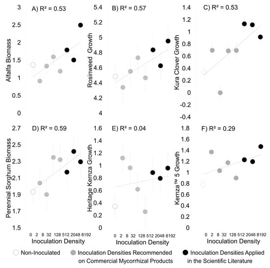Plant growth in the field when plants were grown with no mycorrhizal inoculation (white, open circles ○), with densities of mycorrhizal amendment recommended by commercial producers if inoculum (grey circles ●), and with mycorrhizal amendment densities that have been shown to be effective in the scientific literature (black circles ●). The growth of some plants was positively improved (A–D) or generally unaffected (E,F) by mycorrhizal density. Dots represent the average plant size when plants were grown with each of the eight inoculation densities, error bars are standard error, and lines are best fit lines for plants that had a linear response relationship with inoculation density.