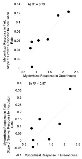 Mycorrhizal response (MR, plant mass when inoculated with AM fungi/grown in sterile soil) in the greenhouse was significantly correlated with plant response in the field to the inoculation density gradient (the slope of the line for plant response to the increasing inoculation density) for plant growth (A) and plant survival (B). Each point represents average MR and slope for a single plant species and lines are best fit lines for each of the two datasets.