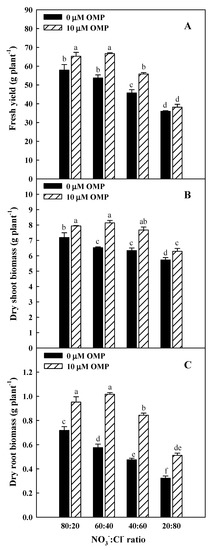 The negative effects of chloride were mitigated by the application of OMP, with a lower beneficial effect of OMP in the treatment 20:80 NO3−:Cl− ratio. In particular, plants growth at 80:20 and 60:40 NO3−:Cl− ratios and treated with OMP showed the highest fresh yield, shoot and root biomass; while those grown with 40:60 NO3−:Cl− ratio and treated with 10 µM OMP did not show a decrease of fresh yield compared to the control without OMP. OMP also determined an increase of the root to shoot ratio (R/S) which is supposed to be a trait of salt tolerance [66].