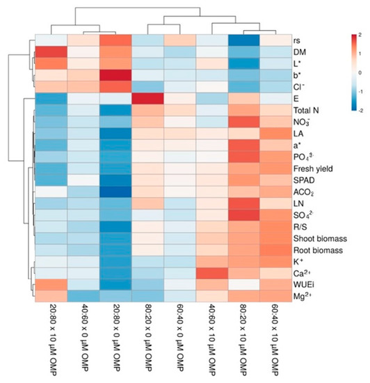 Cluster heat map analysis summarizing plant responses to drench application of (0 µM and 10 µM OMP) and different NO3−:Cl− ratios in the nutrient solution (80:20, 60:40, 40:60, and 20:80). It was generated using the https://biit.cs.ut.ee/clustvis/ online program package with Euclidean distance as the similarity measure and hierarchical clustering with complete linkage.