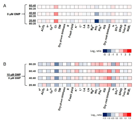 Heat map analysis summarizing the plant response to different NO3−:Cl− ratios (80:20, 60:40, 40:60, and 20:80) and OMP treatments. Results were calculated as Logarithm base 2 (Log2) of 60:40, 40:60, and 20:80/80:20 in control plants (A) or Logarithm base 1.3 (Log1.3) of 10 µM OMP/0 µM OMP control in plants grown at different N (B) and visualized using a false color scale with red indicating an increase and blue a decrease. No differences were visualized by white squares.