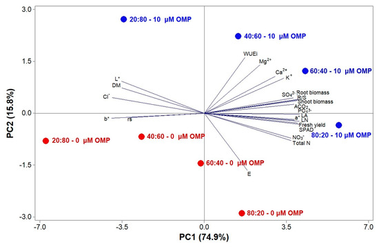 Principal component loading plot and scores of principal component analysis (PCA) of growth parameters, fresh yield, shoot and root dry biomass, leaf dry matter (leaf DM), leaf area (LA) and leaf number (LN), WUEi, total N, mineral concentrations, net CO2 assimilation rate (ACO2), SPAD index, a*, b*, and L*, in untreated (0 µM OMP) and treated greenhouse basil plants with 10 µM OMP grown under different NO3−:Cl− ratios (80:20, 60:40, 40:60, and 20:80).