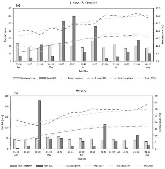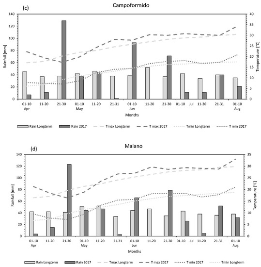 Ten days maximum average temperature (T max), minimum average temperature (T min) and total rainfall during the growing season in Udine (a) during 2016, Aviano (b), Campoformido (c) and Maiano (d) during 2017. Long-term values were the 25-year average.