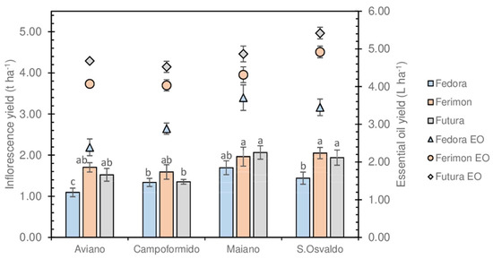 Dry weight inflorescence yield (primary y-axis on the left, columns) and EOs (secondary y-axis on the right, symbols) yield. Means with the same letter are not significantly different. Least significant difference (LSD) at 5% level. Bars represent standard error.