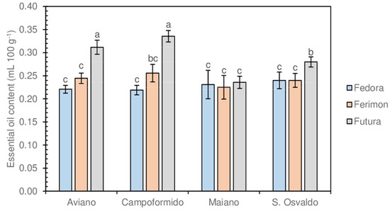 Our results confirmed what was previously reported by Meier and Mediavilla [14]; the concentration of EOs had an opposite trend with respect to inflorescence yield. Indeed, Futura always gave higher EOs content than the other varieties in all locations (Figure 3), with the exception of Maiano, where the highest inflorescence yield was obtained by all varieties (Figure 2).