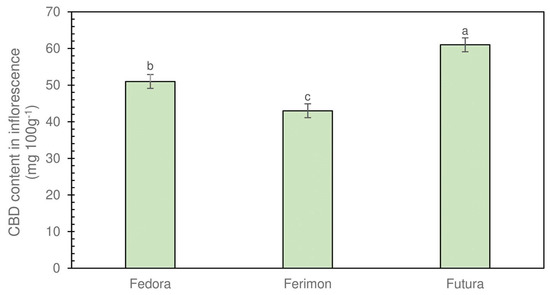 Cannabidiol (CBD) content in the inflorescences. Means with the same letter are not significantly different. LSD at 5% level. Bars represent standard error.