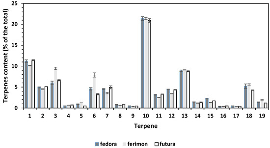 The three varieties showed a very similar terpene composition, with the exception of Ferimon that had a significantly higher concentration of β-myrcene and trans-β-ocimene than the others (Figure 5). The former is an aliphatic monoterpene synthesized from many plants, particularly from hops (Humulus lupulus L.), used as a solvent, in the preparation of synthetic fragrances, pharmaceuticals, personal hygiene products and as food flavoring [49]. While trans-β-ocimene is a monoterpene very widespread in plant species and is one of the components of the pheromones emitted by several insects [48].