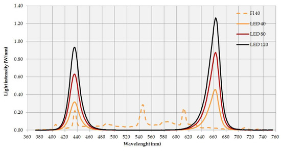 Light-emitting diodes were used as a source of light, and the spectrum consisted of combined red (670 nm) and blue (430 nm) wavelengths at the 7:3 ratio, respectively. The effect of three different photosynthetic photon flux density (PPFD) levels was studied: 40, 80, and 120 µmol m−2 s−1 (here after known as LED 40, LED 80, and LED 120, respectively). The light parameters were adjusted using an LI-250A light meter with a Q 50604 sensor (LI-COR, Lincoln, NE, USA) and a BTS256 spectrometer (Gigahertz-Optik, Turkenfeld, Germany). Fluorescent lamps (Philips TK-D 36W/54) at 40 µmol m−2 s−1 PPFD served as control (Fl 40). Tested light spectra are shown in Figure 1.