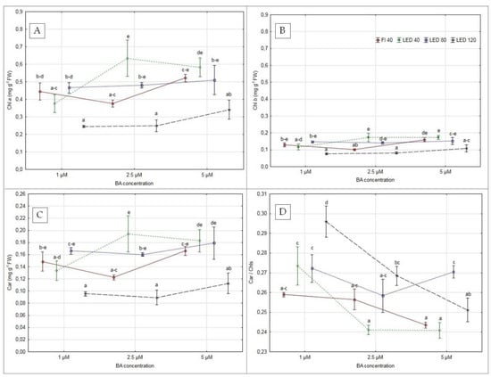 - PPFD 80 µmol m−2 s−1 increased the photosynthetic pigment content in the leaves in comparison to the standard intensity of light. Increased BA concentration raises the content of chlorophyll a.