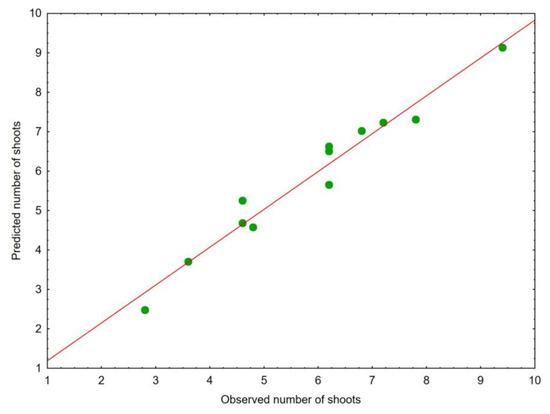 Observed number of shoots of multiplied plantlets versus predicted data generated by the developed regression model.