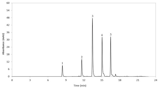 Chromatographic profile of anthocyanidins in the genotype CCC023 recorded at 520 nm. Retention times were: 1: delphinidin (8.07 min); 2: cyanidin (11.59 min); 3: petunidin (13.21 min); 4: pelargonidin (14.92 min); 5: peonidin (16.31 min).